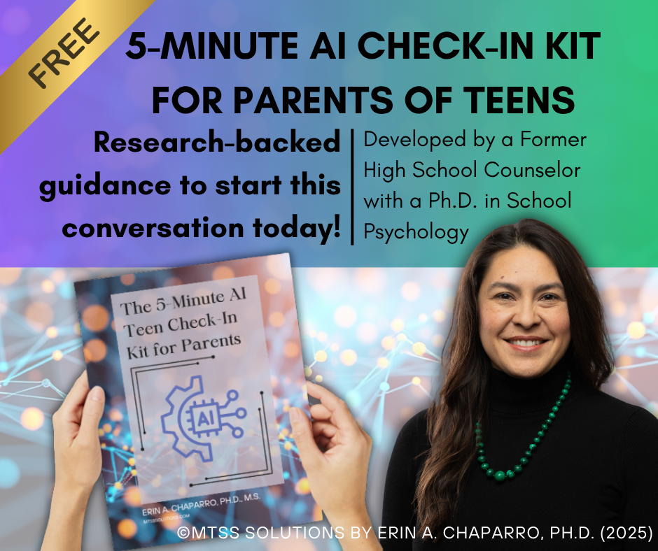 I'm Dr. Erin Chaparro, a former high school counselor, current researcher, and school psychologist. I help families navigate the risks and realities of AI by teaching parents how to build shared values, open communication, and emotionally healthy tech habits with their teens. I look forward to supporting you and your family.Â
